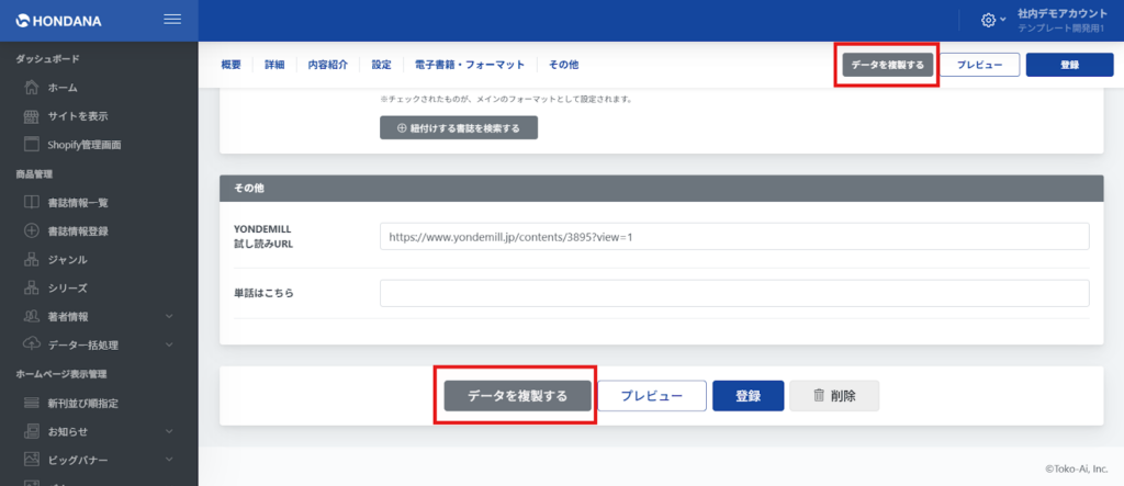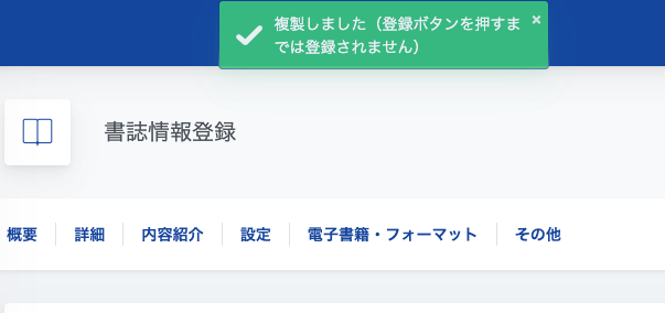 管理画面で登録済みの書誌情報を開くと、「データを複製する」ボタンが表示されます。