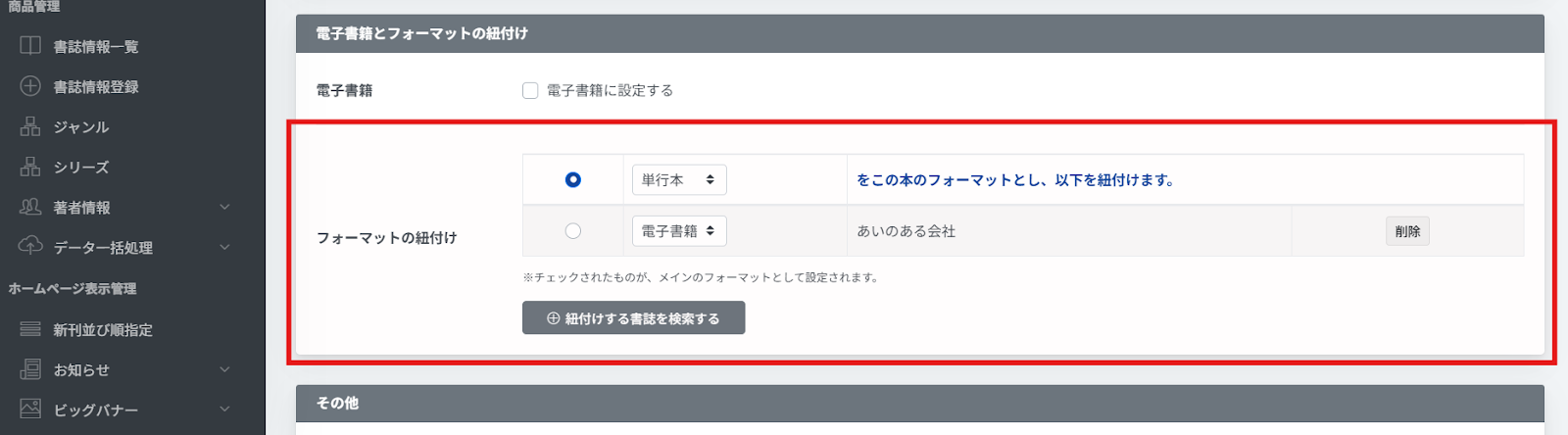 同じ書目でフォーマットの違う商品を登録する際に、それぞれの書誌情報を関連づける機能です。